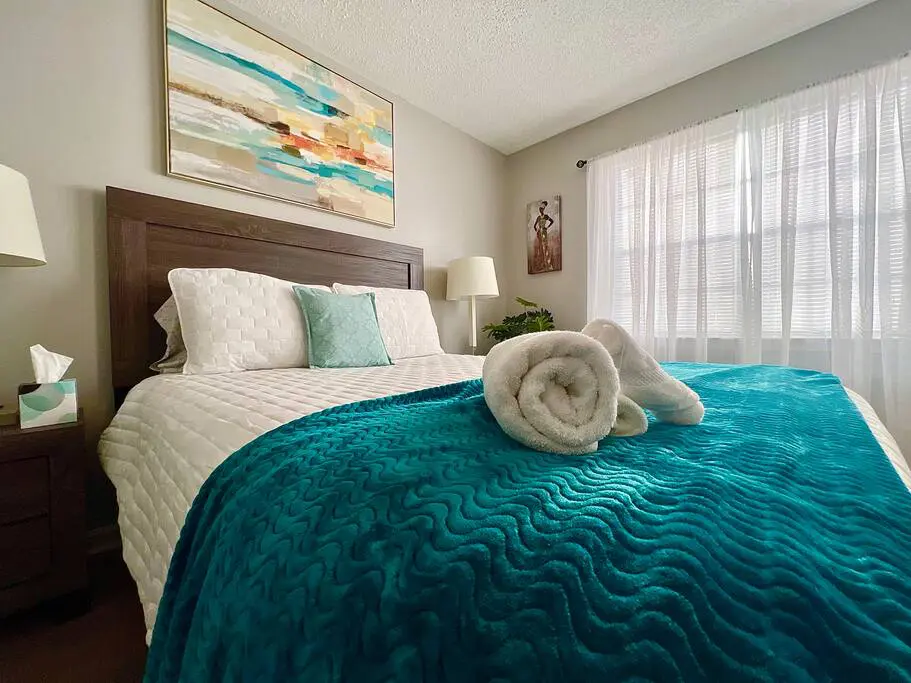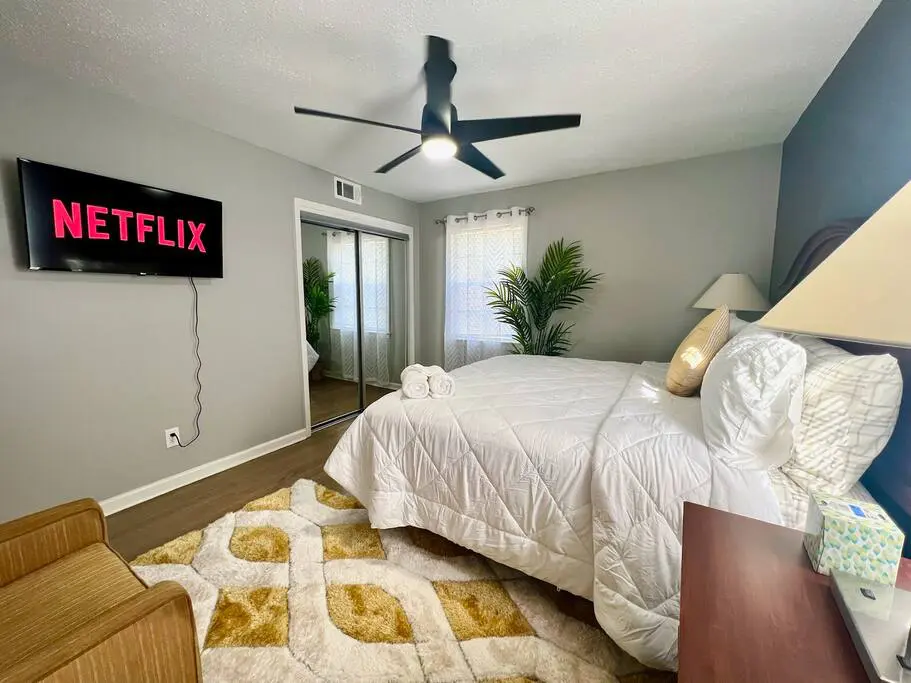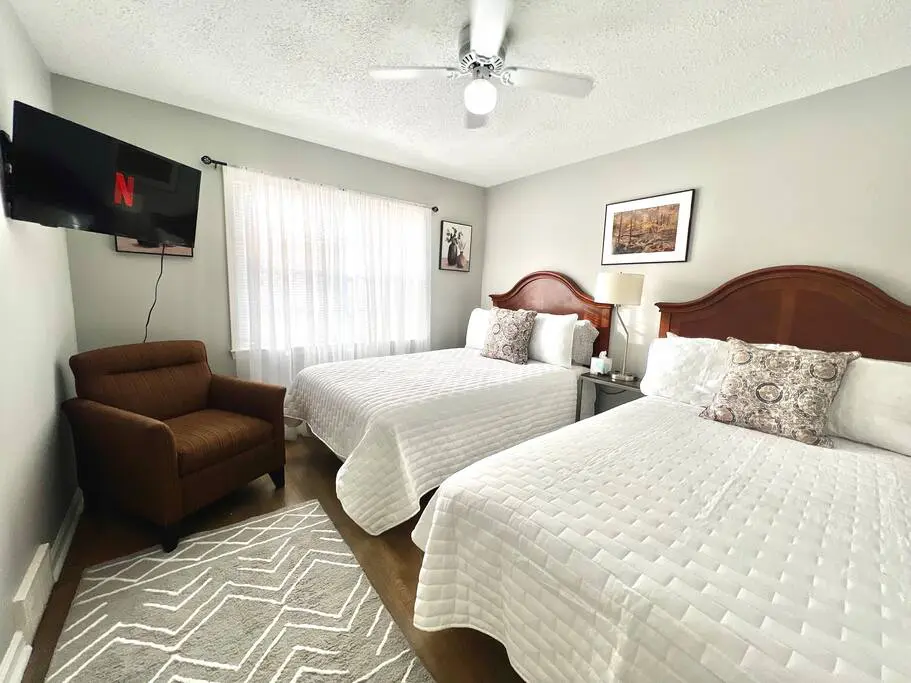 The master bedroom has plenty of space, a king bed, and a private bathroom with walk in shower. The 2nd bedroom has a queen bed and 3rd bedroom has two full-sized beds. All bedrooms have a sitting chair, smart TVs and ceiling fans for convenience and cozy linens for a peaceful night’s sleep.