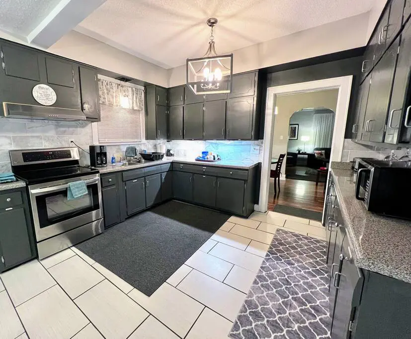 There are three (3) private bedrooms and two full bathrooms. Enjoy the original (refinished) hardwood floors throughout, updated tile in the kitchen and bathrooms, LARGE fully equipped kitchen, ironing board, hair dryer, and extra blankets and pillows are available upon request. Towels will be provided. The kitchen comes fully equipped with all appliances and cookware that is robust enough to prepare all of your meals in-house. In the kitchen you’ll find that we have a waffle iron, blender, pizza pans, stock pot, cooking utensils and much more.